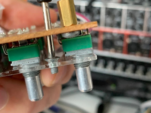 As you can see though, one of the pots is a very much bigger size to the others. The AteOhAte design calls for 2x100KA, 1x1MB and 1x 500B. That 500B was a problem. The only thing I could get with a D-shaft was a dual-gang 1K part wired in parallel.