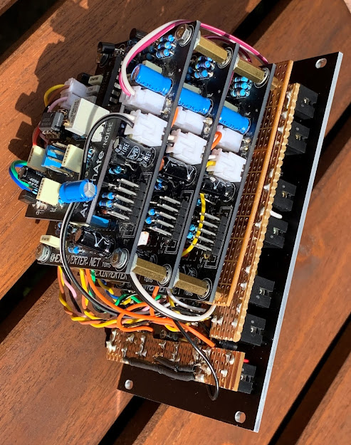 I wasn't that happy with the size of the NeinOhNein Rim Shot and Hand Clap module I made. It's just hard to make a narrow module and not make it extremely deep. The Hexinverter boards were designed for wiring of controls and no control board is provided or specific layout is mandated. Although sized for Eurorack they can be used for 4U, 5U or whatever you want. ReSynthesis made two panels for the Toms, but it's an arbitrary layout. There's a single panel, but the triple is 22HP.